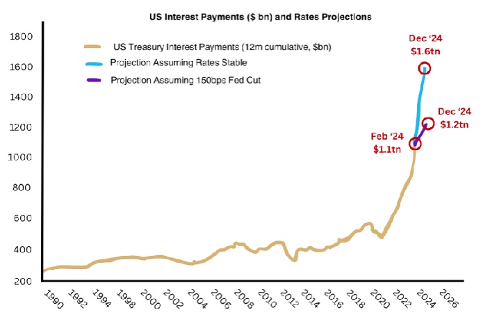 The CBO forecasts interest costs to reach $1.6 trillion by 2034. But if we extrapolate the trends of the deficit and apply current interest rate, the annualised interest cost will reach $1.6 trillion at the end of 2024 rather than in 2034.